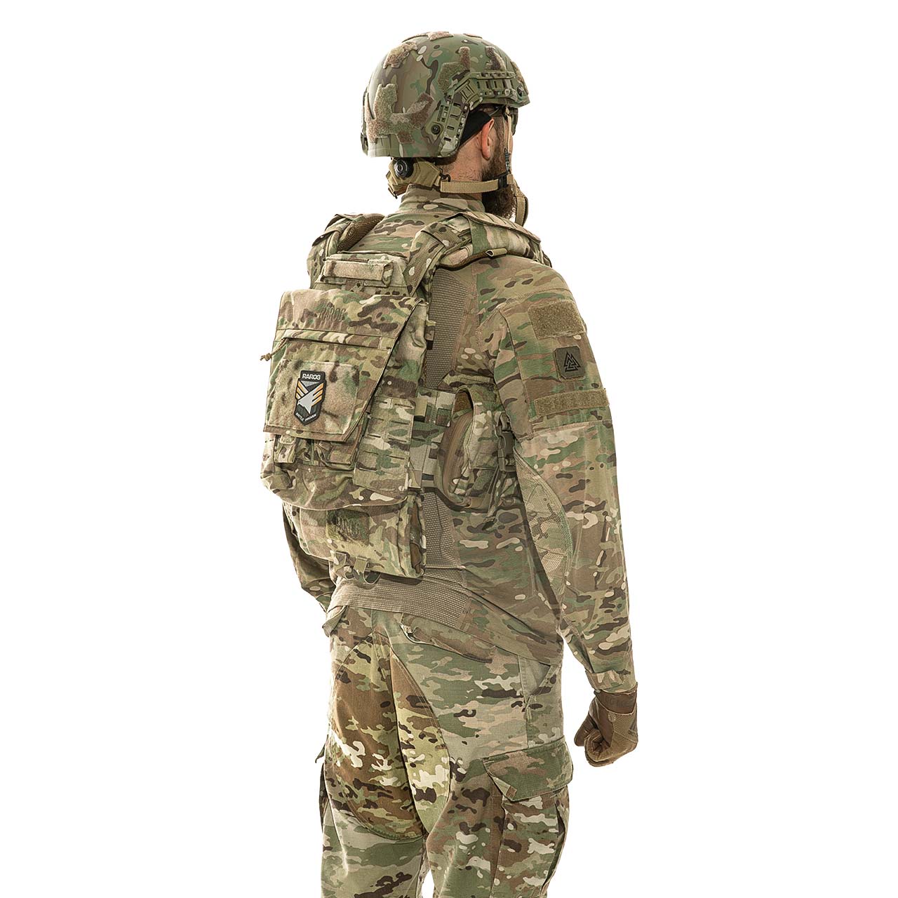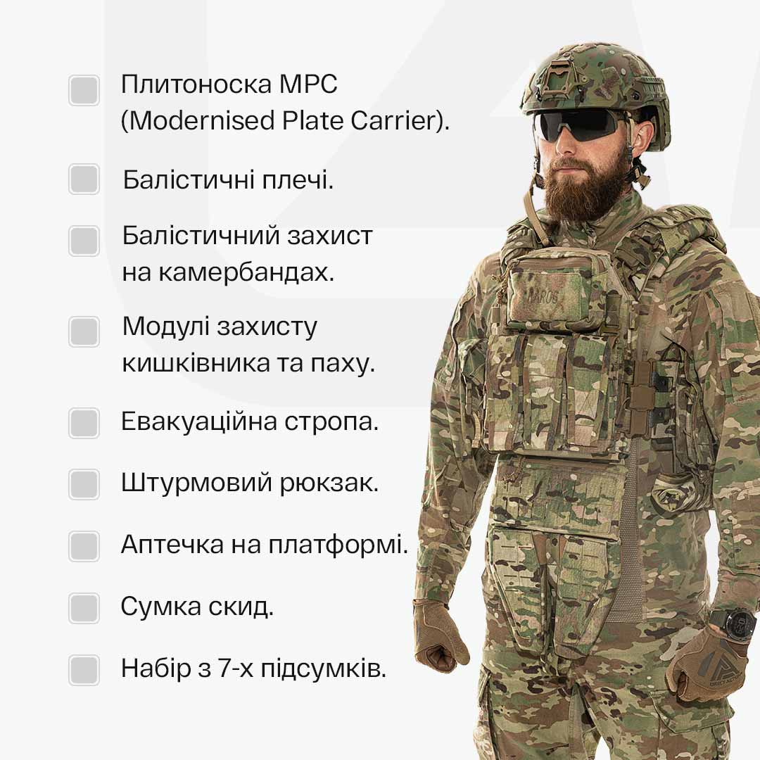 The set includes the Rarog MPC plate carrier, evacuation strap, assault backpack, groin and intestine protection modules, magazine pouches (3 single, 1 double for AK/AR with flap), administrative chest pouch, medical pouch on platform, smoke and tourniquet pouches, drop bag. The set is designed for maximum comfort and efficiency in combat conditions.