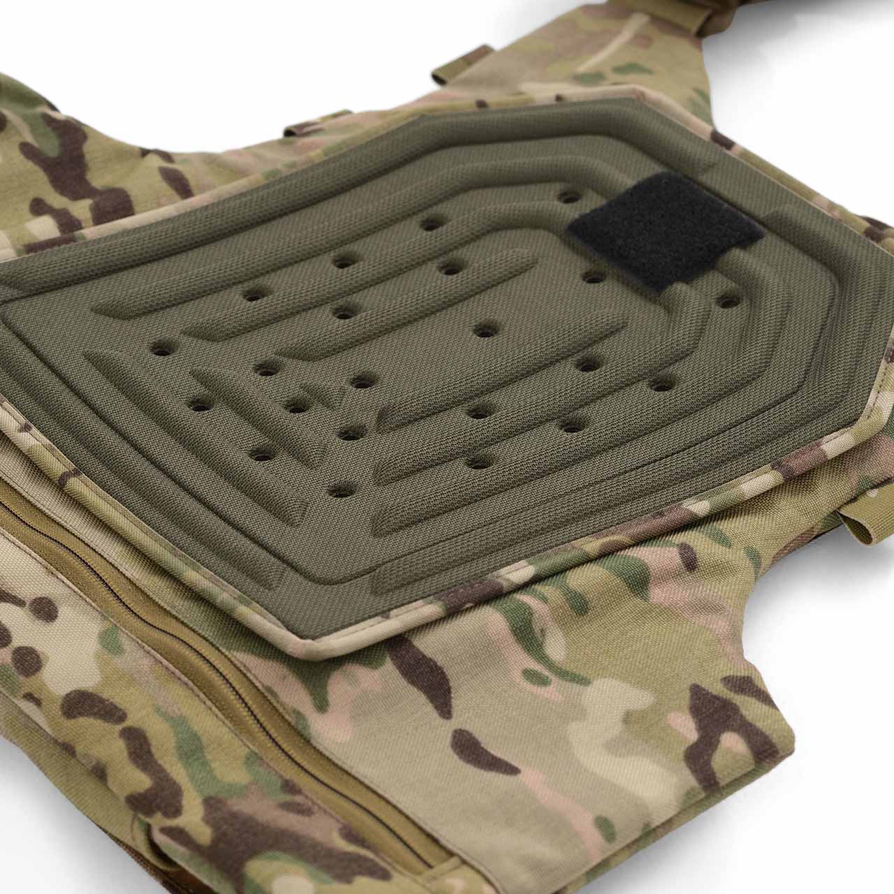 Анатомічний елемент, що зменшує навантаження від бронеплит і підвищує зручність. Жорсткі ребра конструкції сприяють поглинанню заброньової травми та рівномірному розподілу ударної енергії. Перфорована поверхня забезпечує вентиляцію, а форма — щільне прилягання без обмеження рухів. Кріпиться на Velcro та легко встановлюється. Додатково передбачене кріплення для горжета.