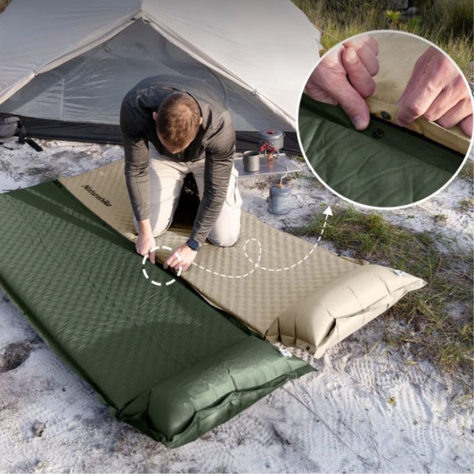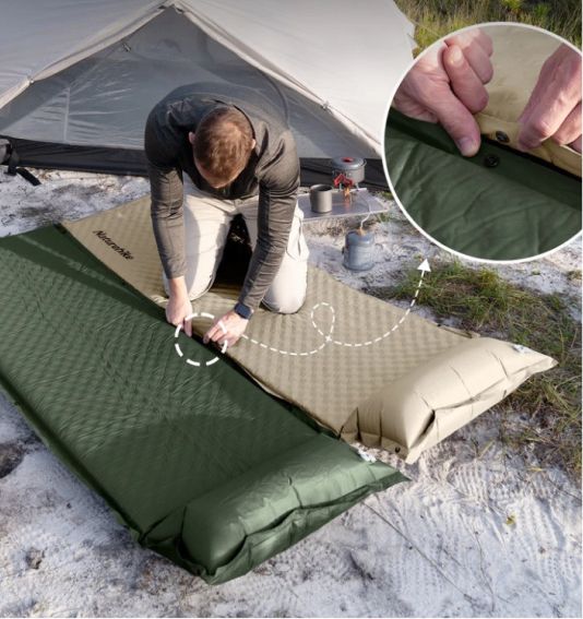 Просто відкрийте клапан — килимок надувається сам, без насоса. При потребі — можна використати помпу для більшої щільності.